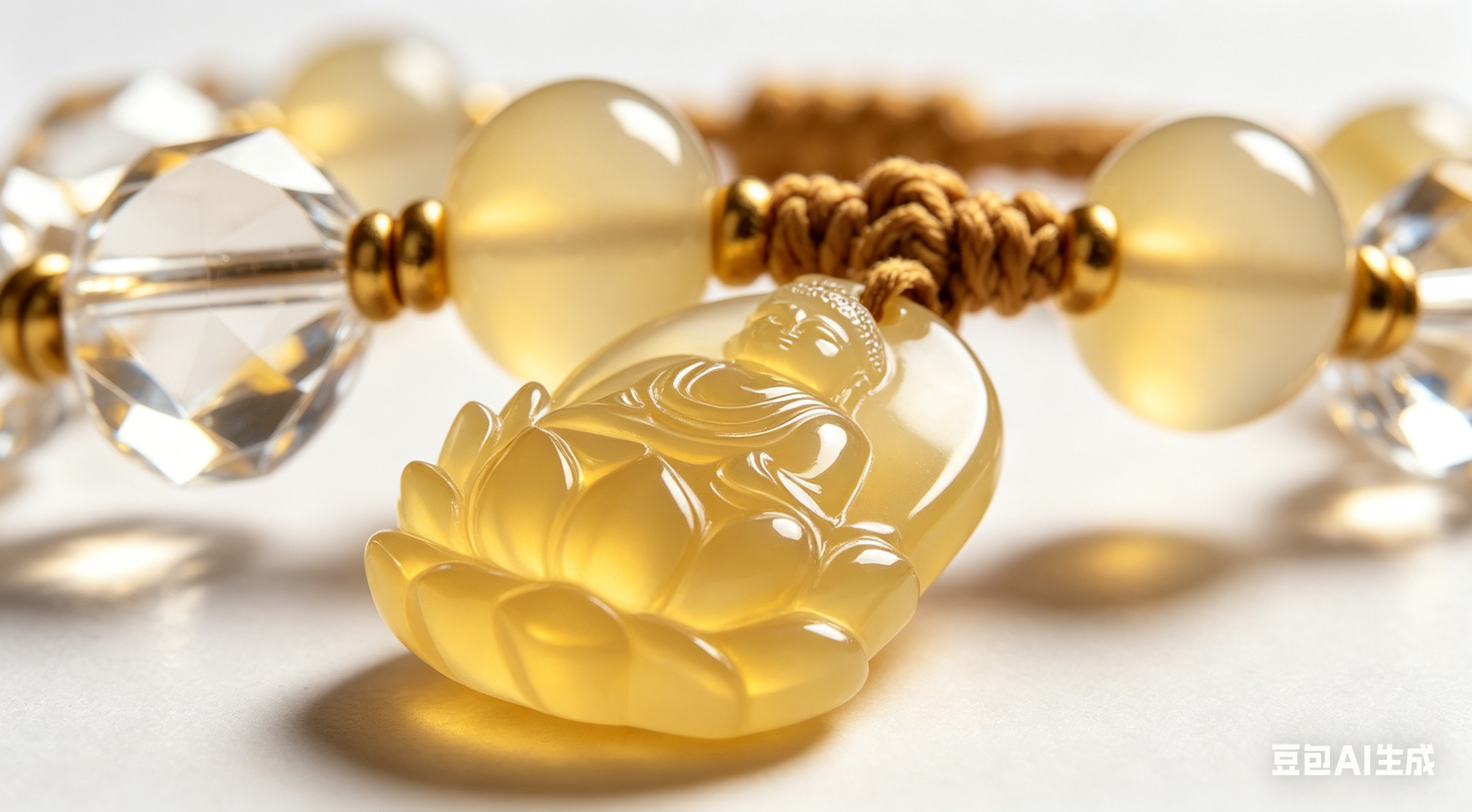Faceted clear quartz beads catch and radiate light from every angle, paired with smooth creamy golden chalcedony beads for warm grounded energy. The intricately carved lotus pendant sits gracefully at the center, anchored by durable hand-braided cord and polished gold accent beads.