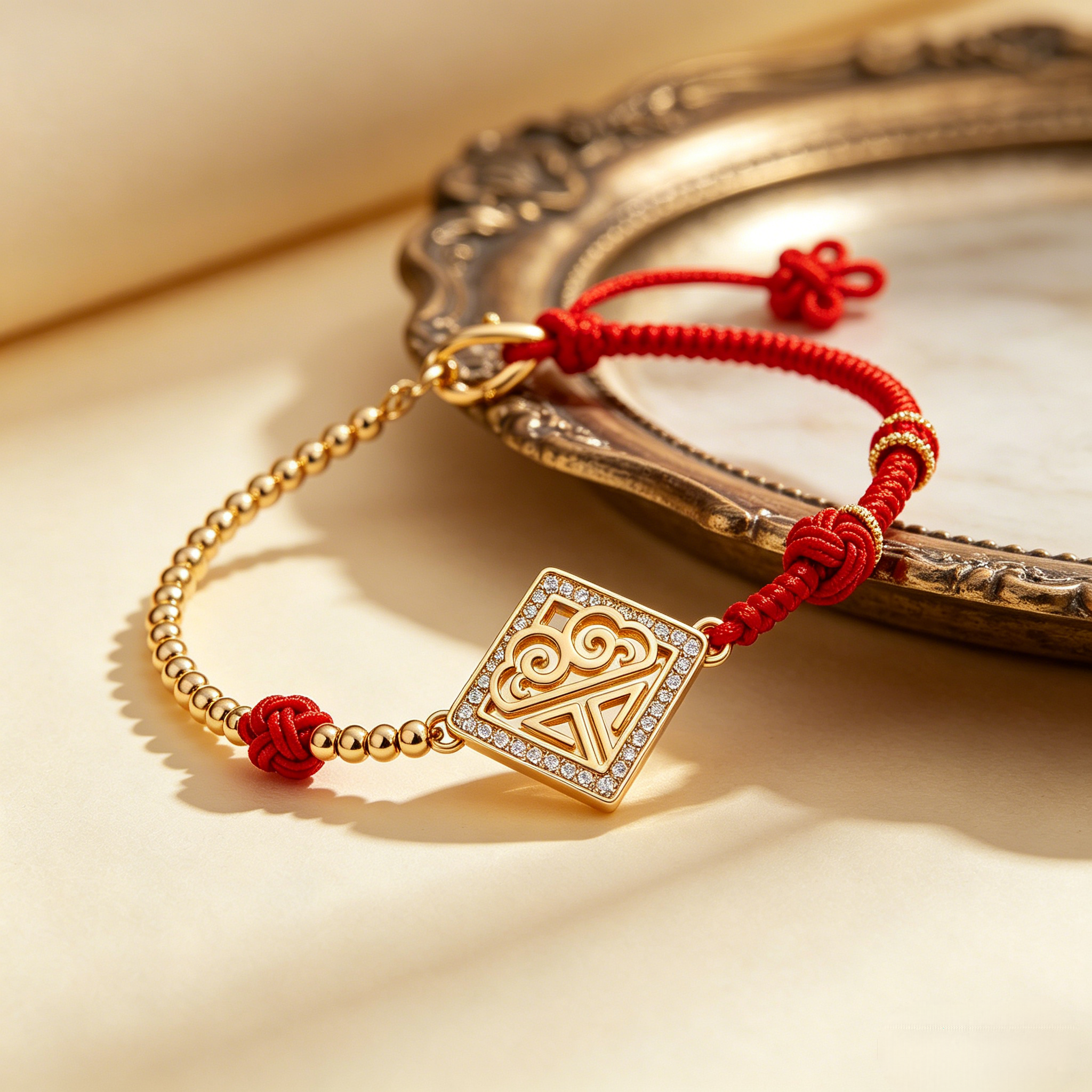 We combine durable hand-woven lucky red cord and delicate polished gold bead chain, finished with traditional hand-tied knots and an adjustable sliding closure for a comfortable, custom fit for every wrist.